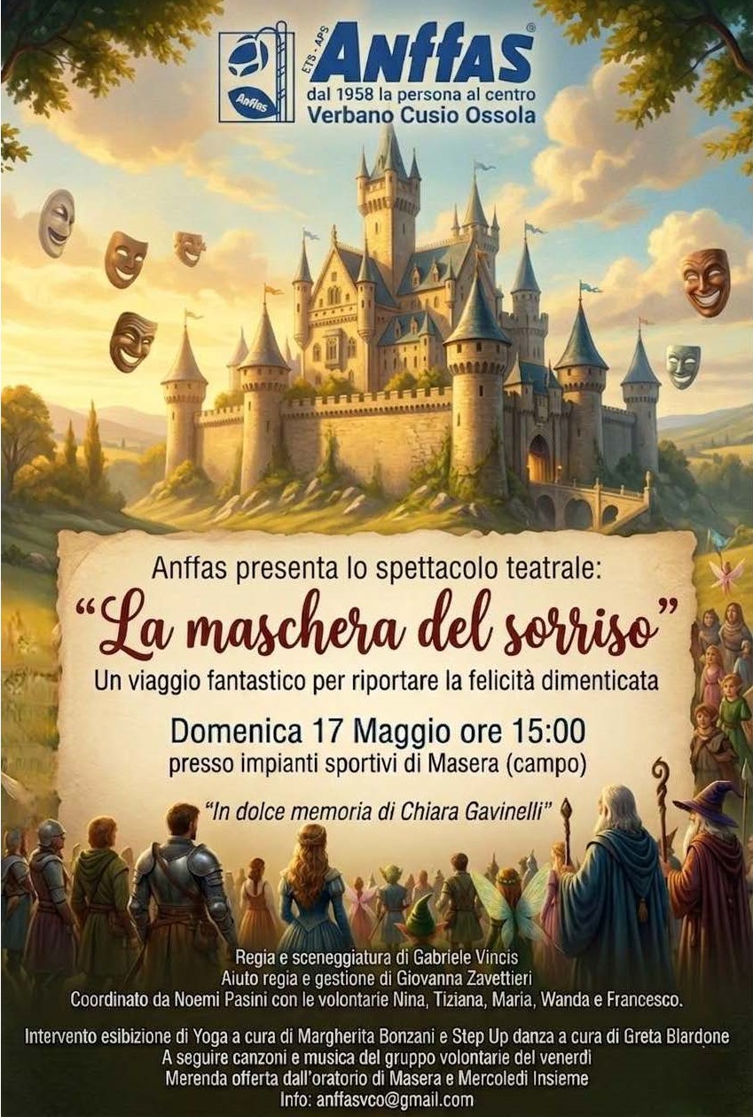 Prosegue con entusiasmo la nostra attività teatrale, un progetto consolidato negli anni che unisce l'impegno dei volontari al supporto di professionisti del settore, creando un percorso inclusivo unico nel suo genere. Il laboratorio culminerà domenica 17 maggio alle ore 15.00 presso gli impianti sportivi di Masera, dove andrà in scena lo spettacolo originale intitolato “La maschera del sorriso”.